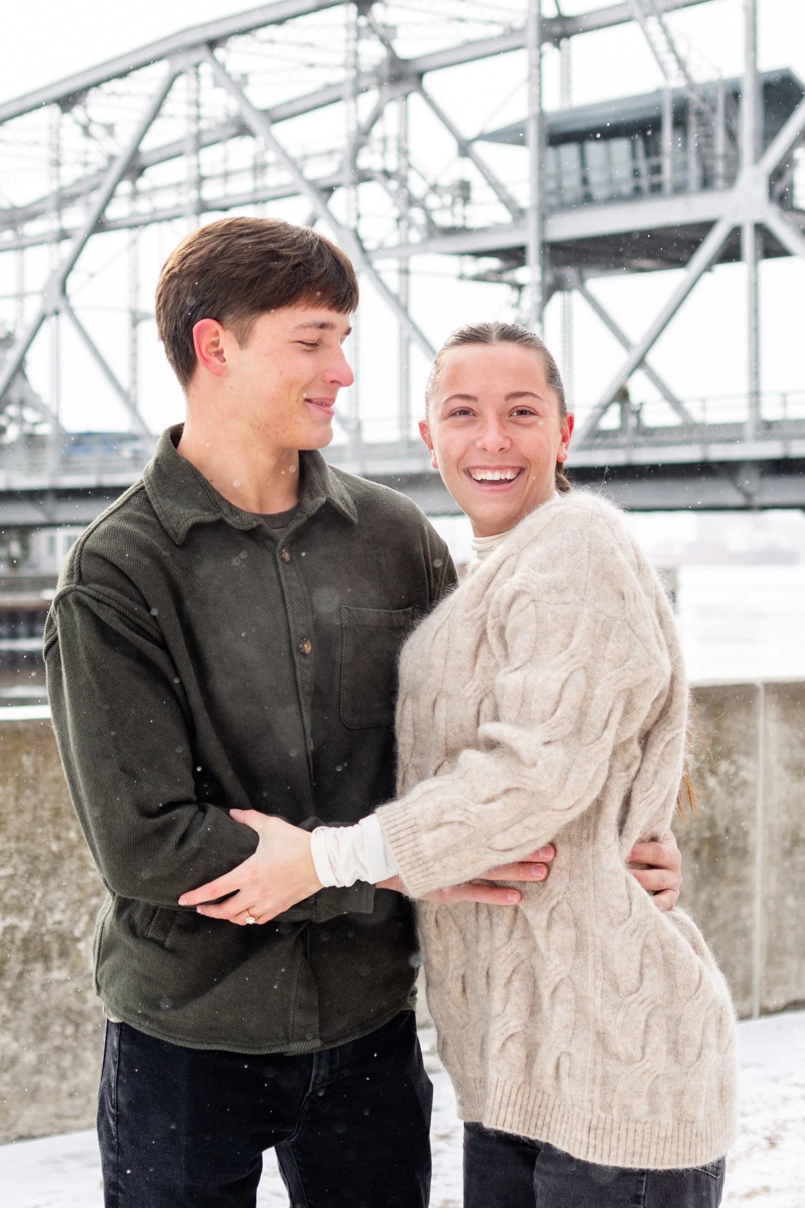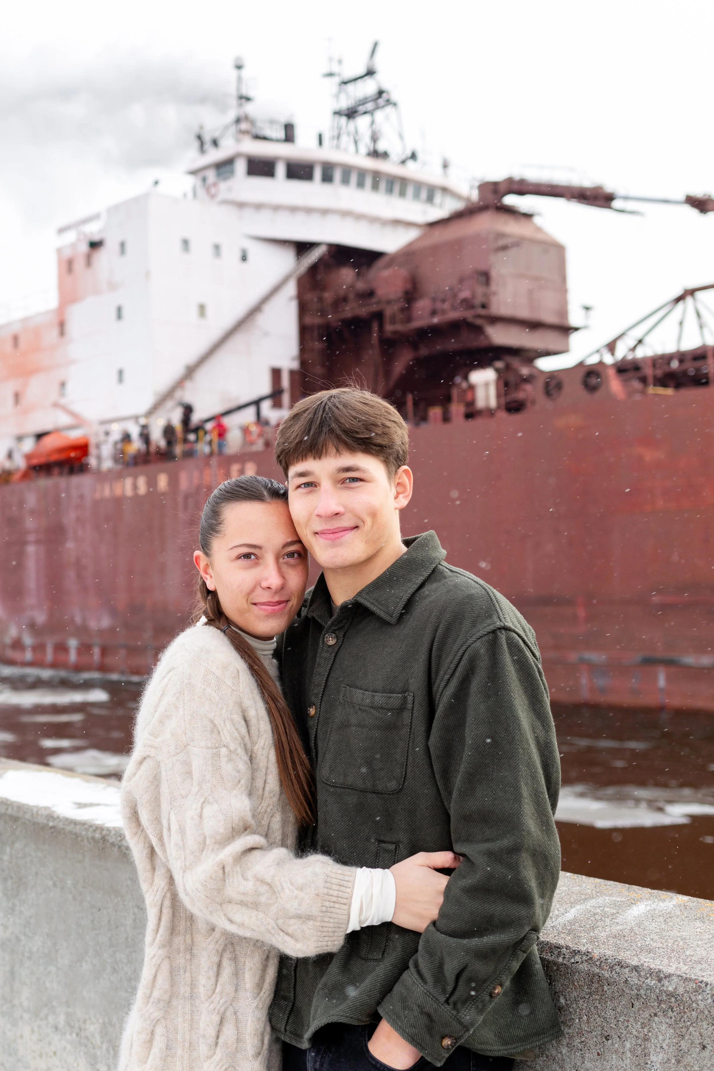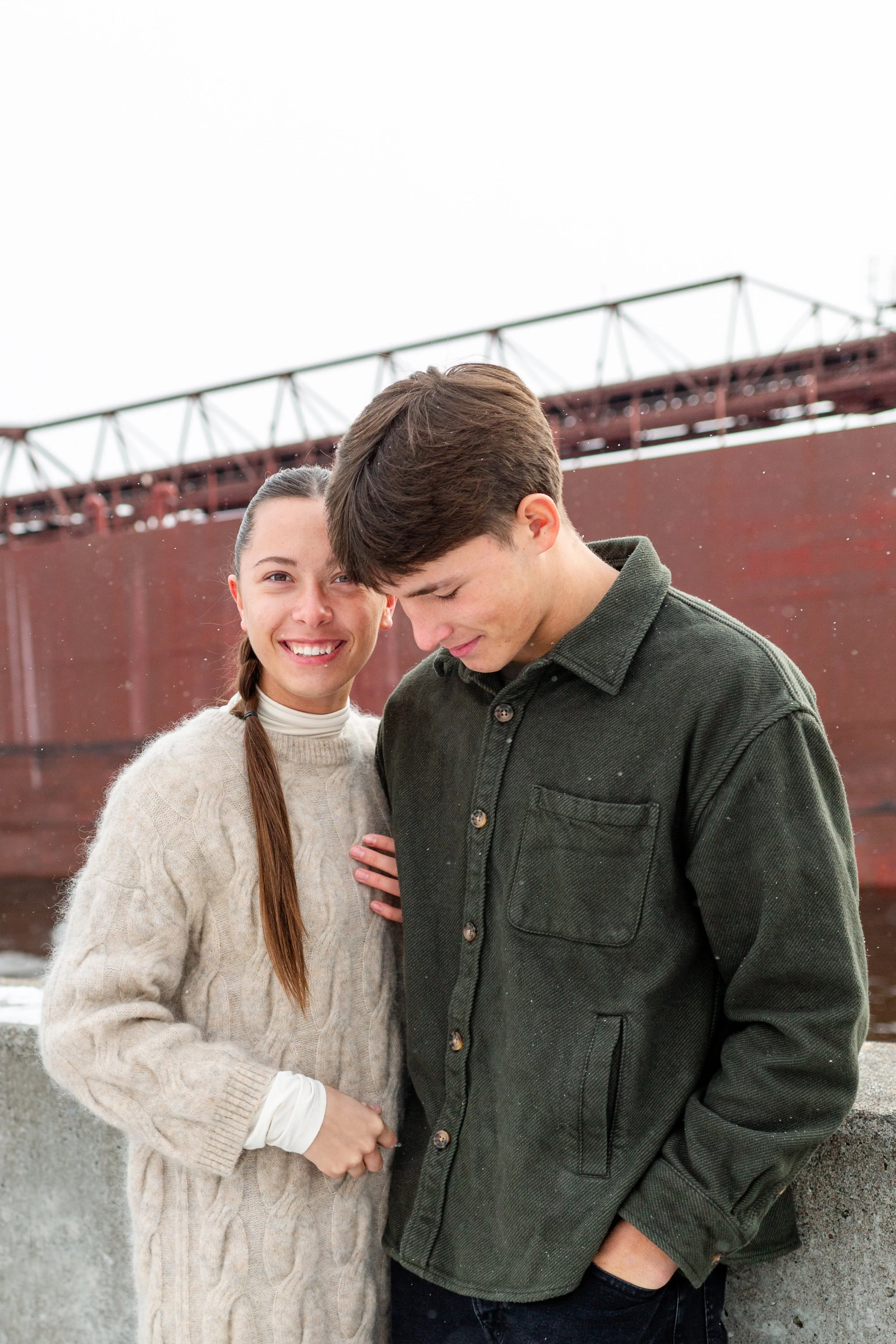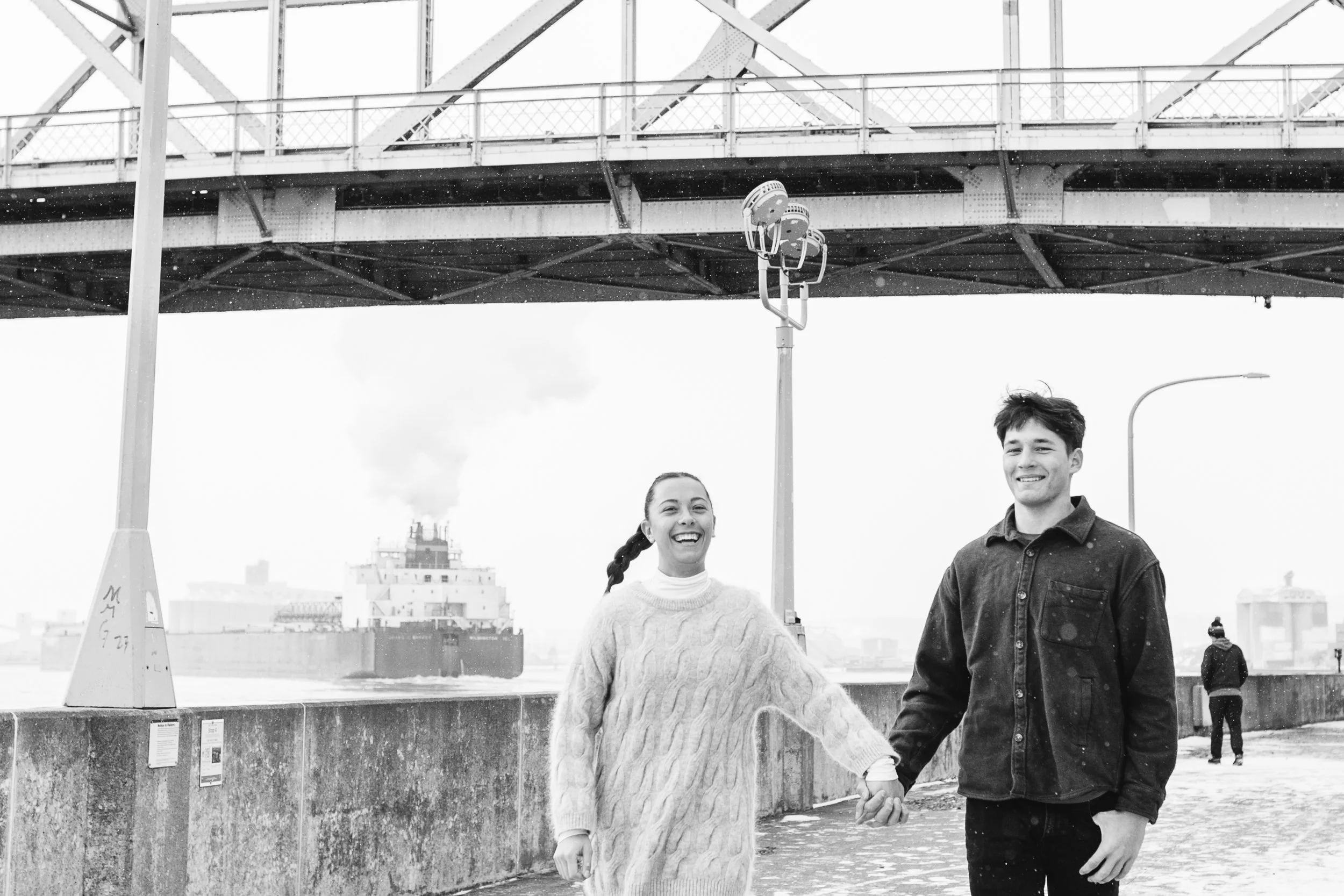These two. <3 Gabriel is my niece and her and Callan together are just the sweetest. We planned to meet at the Duluth Courthouse for photos in the courtyard, and the lighting turned out so perfectly on such a cold January day! We managed about 15 minutes there and then spontaneously decided to scurry down to the canal, and wouldn’t you know it, a ship was coming through! Talk about a classic Duluth scene. The bridge attendant announced over the loudspeaker that this was the last ship coming through for the season too. We got lucky! I looooove the ship and bridge photos so much, especially with the sparkly snowflakes falling down.